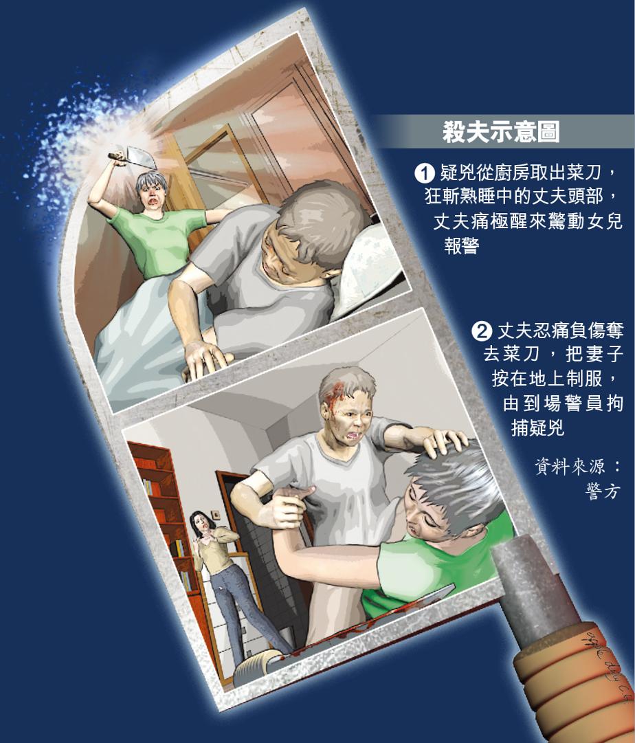 【本報訊】葵涌麗瑤邨發生殺夫兇案,患精神病多年老婦昨凌晨趁丈夫熟睡,從廚房取出一把菜刀,朝丈夫頭部狂斬六刀,丈夫劇痛驚醒呼救,驚動睡在客廳的女兒報警。男事主負傷制服妻子後由警員送院搶救,但傷重死亡,妻子則涉嫌謀殺被捕送院。警方指疑兇患精神病多年,有指她懷疑丈夫有婚外情,警方正循其精神狀況、夫婦感情及經濟狀況等多方面調查。