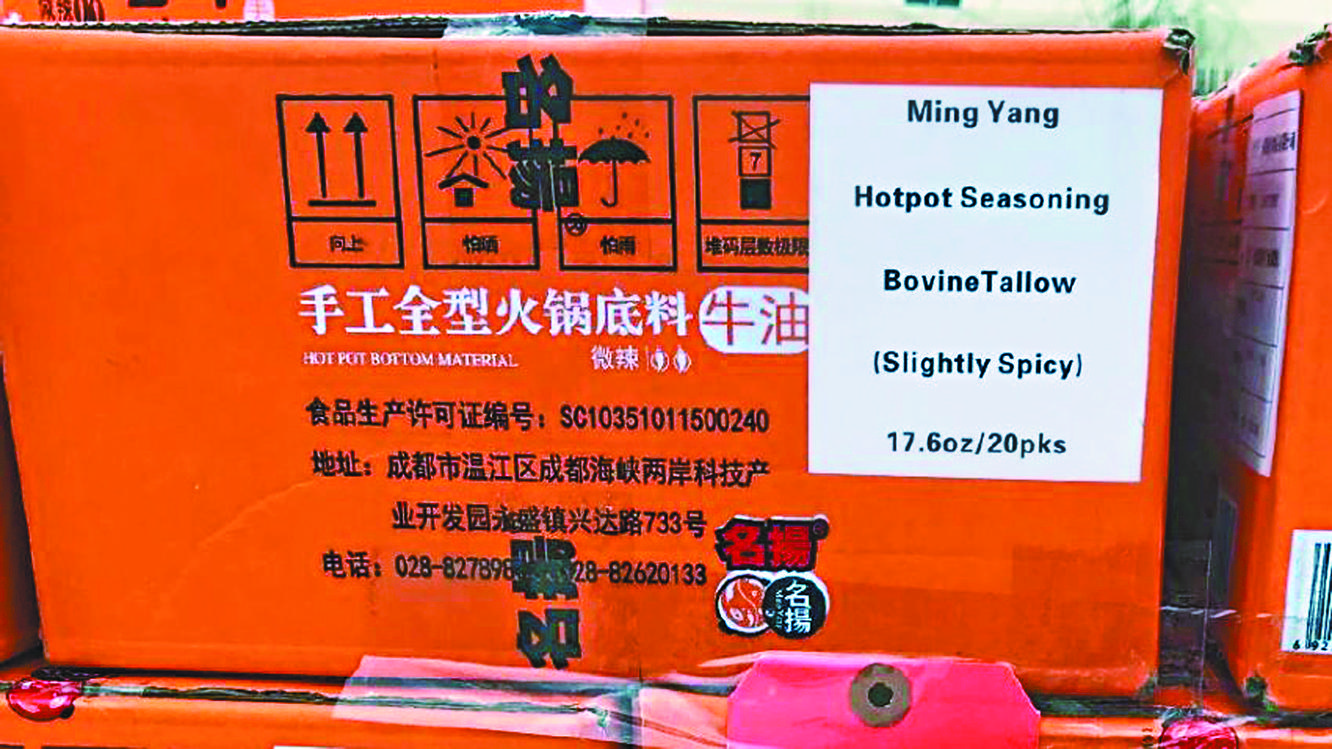 內地火鍋湯底品牌「名揚」(Ming Yang)的三款產品在美國被列為「危害健康」及「可致死」產品。美國食品安全檢查局(FSIS)下令將名揚的火鍋湯底全面下架及回收;原因是其所含有的牛脂,來自屬於「非美國評定合格牛肉生產國」的中國。
