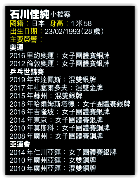 日本不少運動員有綜藝或戲劇演出經驗,乒壇名將石川佳純亦不例外,數年前曾在新垣結衣主演的電影客串,去年武肺疫情居家隔離期間,她更曾在社交平台大騷廚藝,展示多才多藝一面。不過,對於剛年滿28歲的石川而言,眼前最重要相信是因肺炎疫情延期一年舉行的東京奧運,因為這或是她爭取奧運單打獎牌的最後機會。