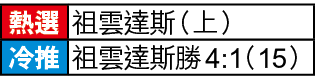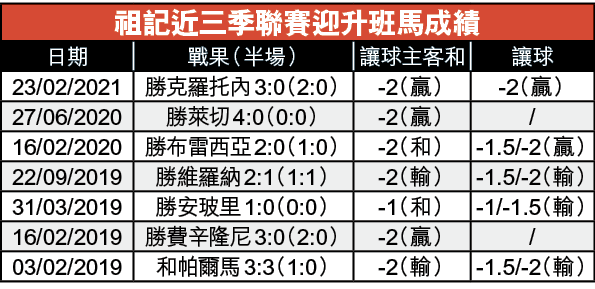 祖雲達斯近季迎戰升班馬成績亦不俗,包括今季在內,近3季迎升班馬至今共獲6勝1和,當中有4場是淨勝2球或以上(見附表),因此,就算今役要讓球半/兩球,上盤仍可期。