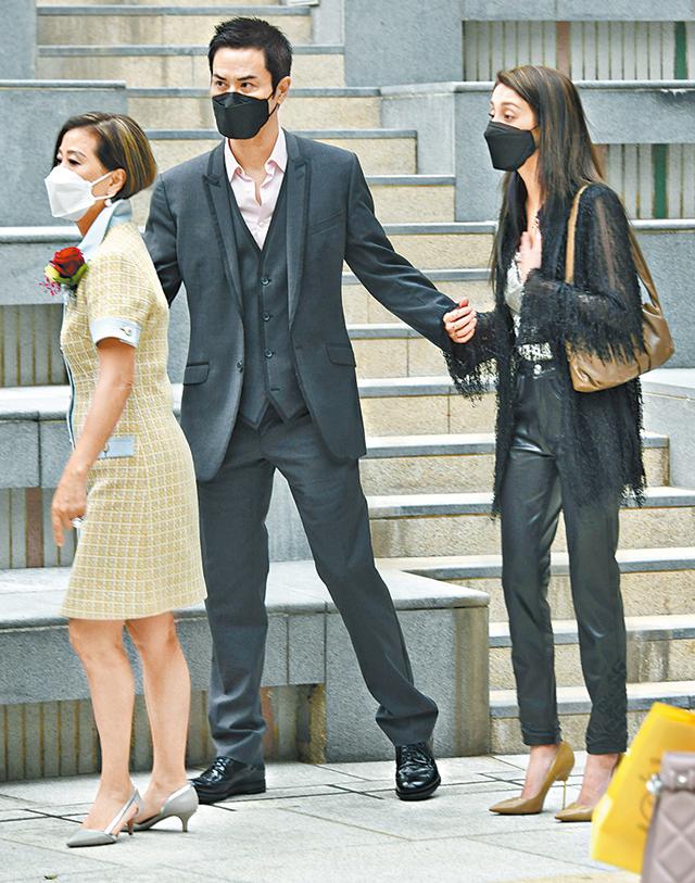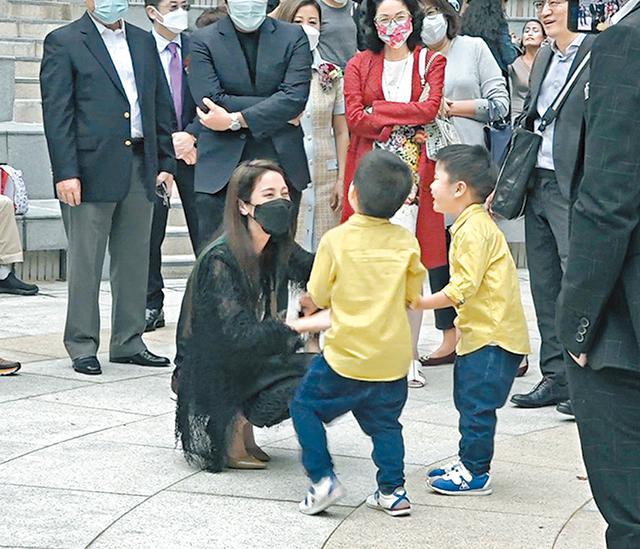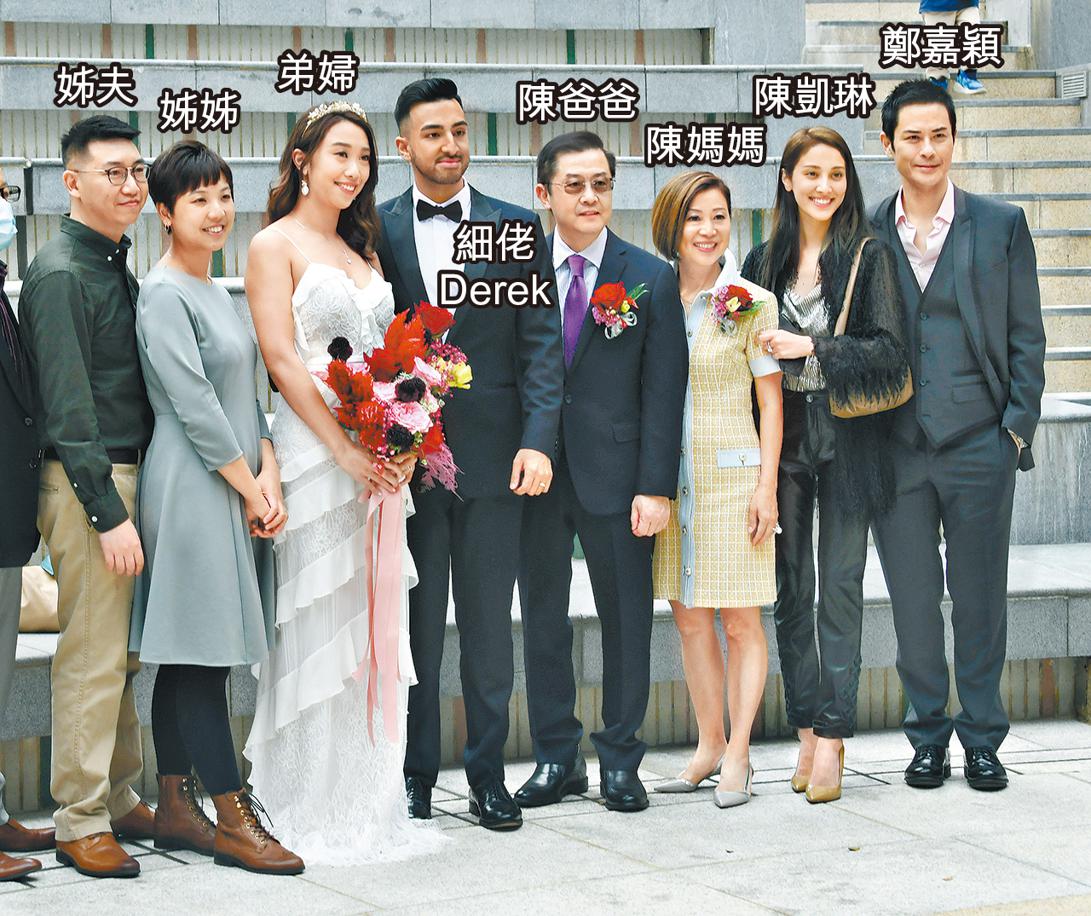 陳凱琳(Grace)的29歲孖生細佬Derek昨日註冊結婚,昨午約3時,一對新人率先到達紅棉路婚姻登記處,未幾陳爸爸和陳媽媽一齊現身,大約3時15分,鄭嘉穎拖着老婆Grace抵達,不過未見兩名幼子,而二人現身即時引起其他準備註冊新人的注目。完成註冊儀式後,眾人到鄰近的奧林匹克廣場除罩影大合照,嘉穎非常融入家中,與Grace的親友不停聊天,合照後,他們就戴回口罩離開。