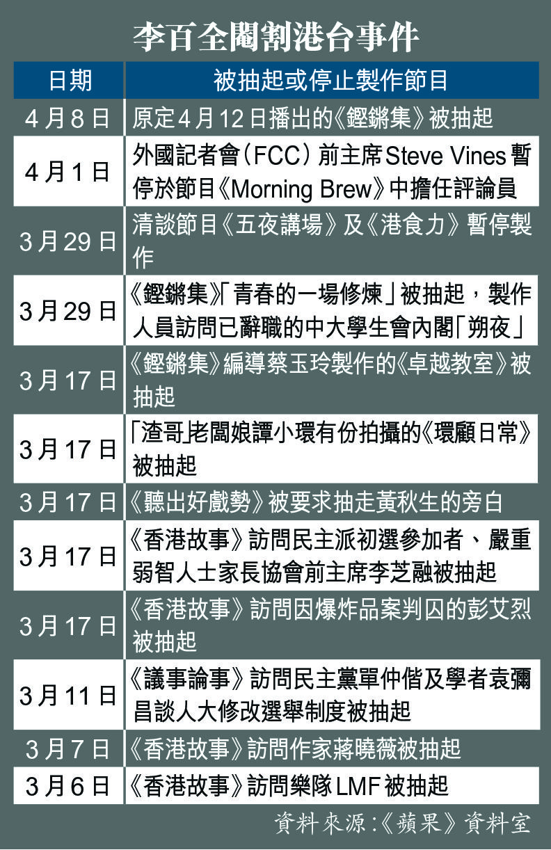 另外,本報綜合港台消息,原定下周一播出的《鏗鏘集》再被抽起,擬改由文教組製作的另一集頂替。據了解,被抽起的該集節目探討武漢肺炎疫苗,訪問普通家庭、長者和老人院等講述對接種疫苗的掙扎,暫時未知何時會播出疫苗專題。有港台消息指,疫苗專題由原有的《鏗鏘》團隊班底製作,更曾向統籌疫苗接種的公務員事務局局長聶德權發出訪問邀請,「但最後turn down咗」。