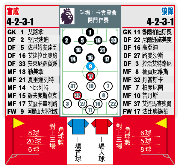 上輪富咸作客挑戰阿士東維拉,雖然靠着最近狀態火熱的阿歷山大米祖域先開紀錄,可惜後防在下半場尾段連番犯錯斷送好局,被維拉連入3球反勝3:1,在多賽1場下仍落後紐卡素3分。雖然富咸在2月曾有過起色,一度保持五場不敗,可惜自從上月初作客擊敗利物浦以來,富咸已經連續輸給曼城、列斯聯以及維拉,錄得三連敗。另外富咸今季的主場成績為全英超最差,在卡雲農舍球場出戰16場比賽僅取10分,而且只攻入九球,今戰於地頭出擊並無明顯優勢。