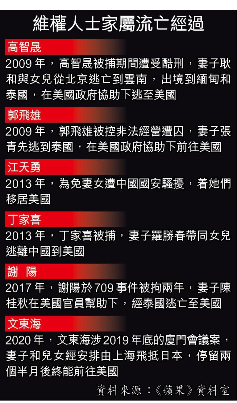 內地維權人士的家人逃亡國外並不鮮見,維權律師文東海被指涉前年12月的廈門會議案後,一度被失蹤四個月,其間他的妻子周友芳帶同一對子女先出境至日本,逗留兩個多月後才能出發往美國。