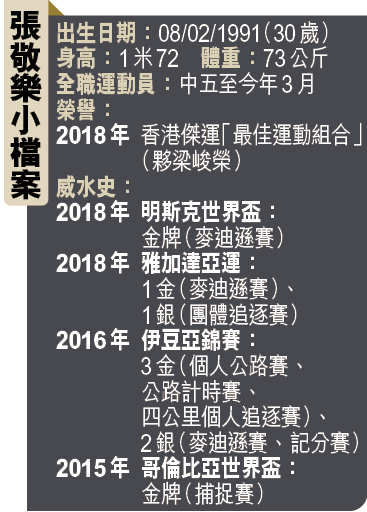 【本報訊】繼壁球的歐氏姊弟歐詠芝及歐鎮銘、陳浩鈴、羽毛球周凱華在這疫情期間宣佈退役後,又有本地星級運動員急流勇退,他們就是單車的張敬樂及小師弟馮嘉豪。今年2月滿30歲的阿樂以往在公路及場地單車賽獲獎無數,最近期是2018雅加達亞運會奪男子麥迪遜金牌,馮嘉豪則是雅加達亞運公路賽代表。
