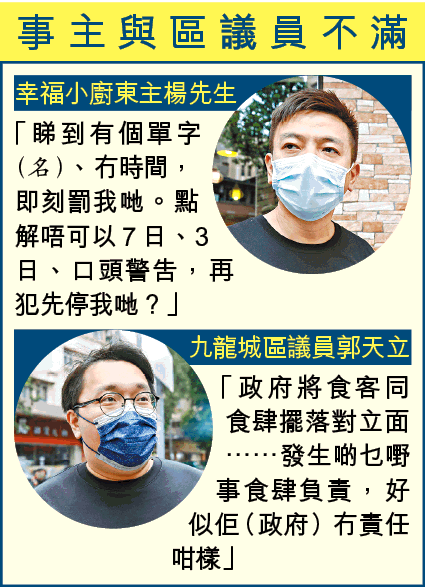 紅磡及黃埔至少五間食肆被指顧客登記資料不齊全,被罰停晚市14天,以及午市由每枱四人收窄至每枱兩人。幸福小廚東主楊先生指出,「(食環署人員)睇到有個單字(名)、冇時間,即刻罰我哋」,他反映店員難以控制客人如何登記資料,亦沒權查核顧客身份證,惟對方卻只稱「你有咩同個官講喇」。他估計未來14天合共將損失10多萬生意額,「既然政府要我死,我可以點樣做?」