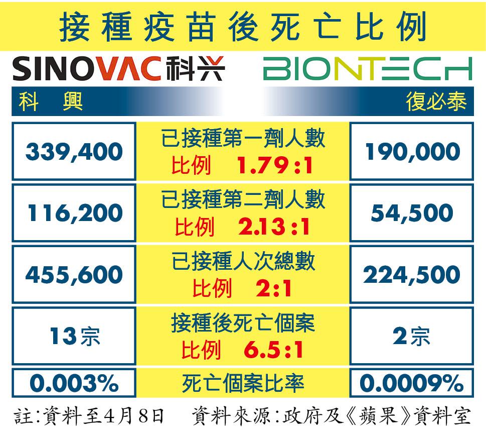 截至昨日,政府為市民接種共約700,100劑疫苗,包括接種科興疫苗的455,600人次,以及接種復必泰疫苗224,500人次,兩者接種人次比例為2:1。疫苗自2月26日開打至今,已有15宗個案在接種疫苗後死亡,科興疫苗接種者累計有13宗,復必泰只有2宗,比例是6.5:1。接種科興疫苗後死亡個案比率是0.003%,平均每10萬名接種者有3人死亡;復必泰則明顯較低,比率為0.0009%,平均每10萬人有0.9人死亡;即科興高復必泰逾兩倍。