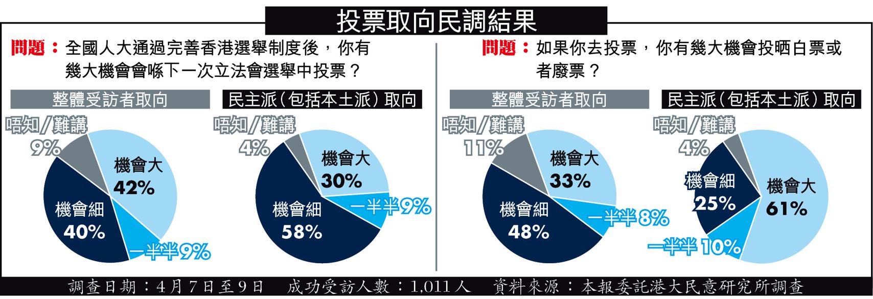 本報委託的調查於4月7日至9日進行,成功訪問1,011位香港居民。民調先詢問市民在2019年區選的投票立場,以區分受訪者政治傾向,再詢問受訪者:「全國人大通過完善香港選舉制度後,你有多大機會喺下次立法會選舉中投票?」結果顯示,42%選民稱再投票機會大,40%市民指再投票機會細。民主派包括本土派支持者中,則有58%表明再投票機會細,表示機會大只餘30%。
