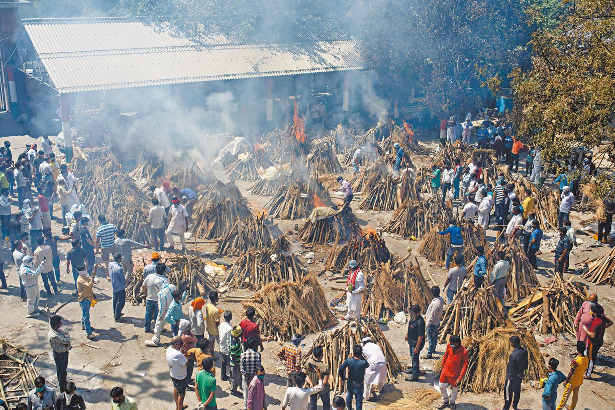 火葬場也不勝負荷,重災區如新德里要集體火化,中部大城市博帕爾(Bhopal)有火葬場要大量增加火葬堆,通宵火化。為加快速度,印度教徒讓逝者從生死輪迴解脫的重要殯葬程序也要省掉。有地方政府接到要求,欲砍伐公園樹木作為柴。