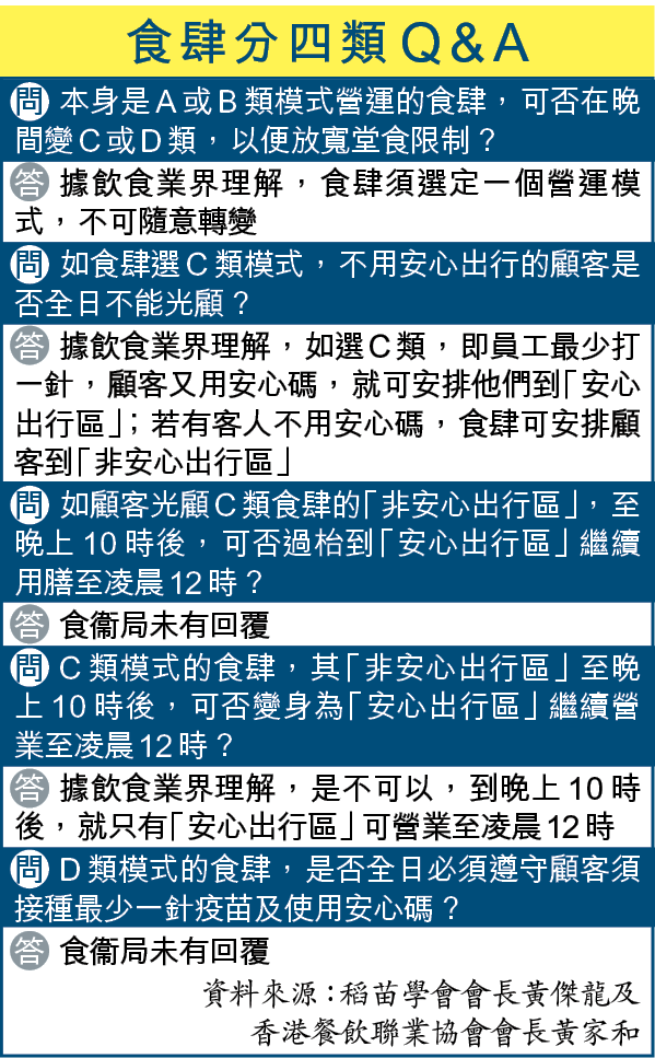 舉例說,食肆可否在晚上10時前採用B類模式營運,接待不願使用安心出行顧客,然後10時變身為C類、甚至D類,接待使用安心出行甚至已接種顧客?食衞局沒有答案,業界也不清楚。