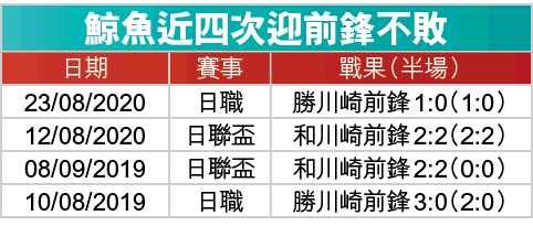 鯨魚今季至今只失三球,是日職失球最少球隊,加上近4次迎前鋒共獲2勝2和不敗(見附表),今役要捧受讓的鯨魚。
