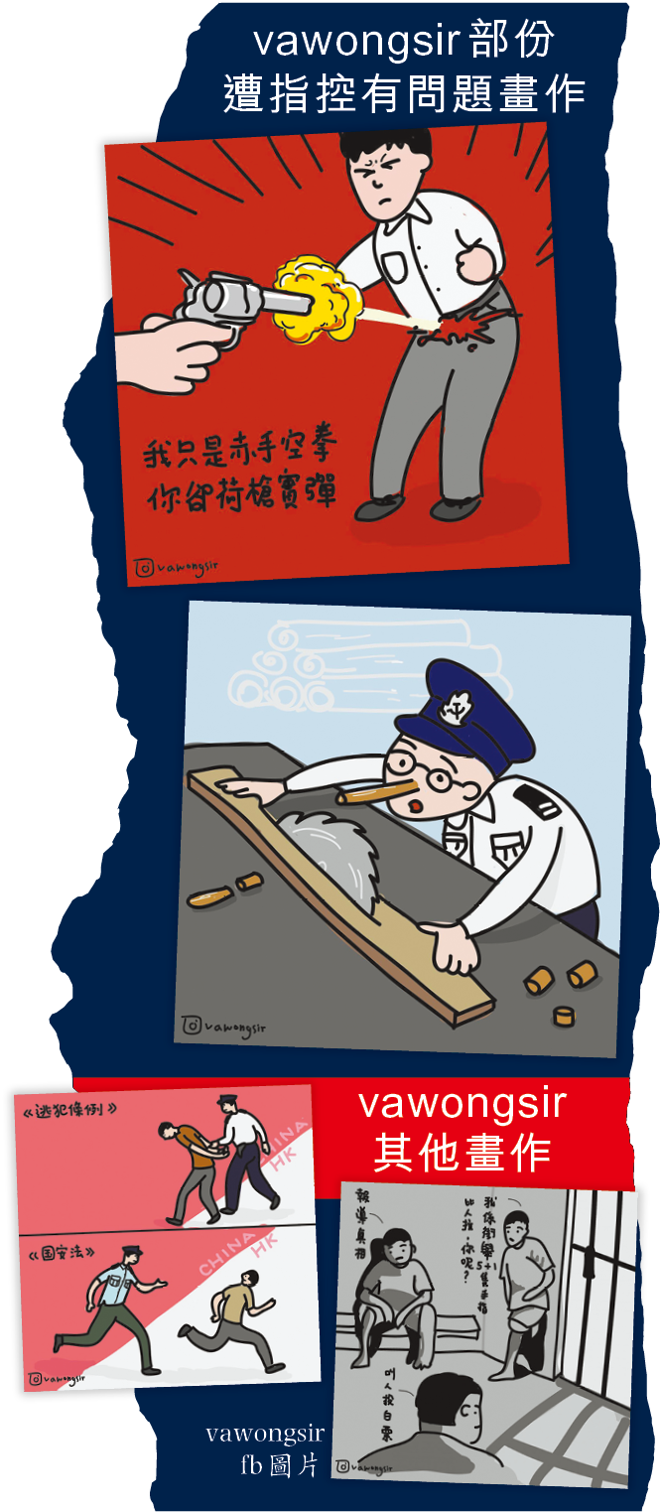 【本報訊】再有教師面臨釘牌極刑。於社交媒體創作政治漫畫的中學通識科教師「vawongsir」(黃Sir)昨披露,自去年被匿名投訴指控其公餘時間上載的漫畫不恰當後,教育局裁定他專業失德的投訴成立。據了解,當局信中列舉有問題的漫畫,包括一名男仔被人用左輪手槍射擊並寫上「我只是赤手空拳 你卻荷槍實彈」及時任警察公共關係科高級警司江永祥被畫成鼻子不斷變長的木偶等諷刺警方的漫畫。教協副會長葉建源認為教師作為市民,對社會問題或政府施政有意見,並在社交媒體發表,看不到與其專業表現有何關係,批評當局裁決不合理。