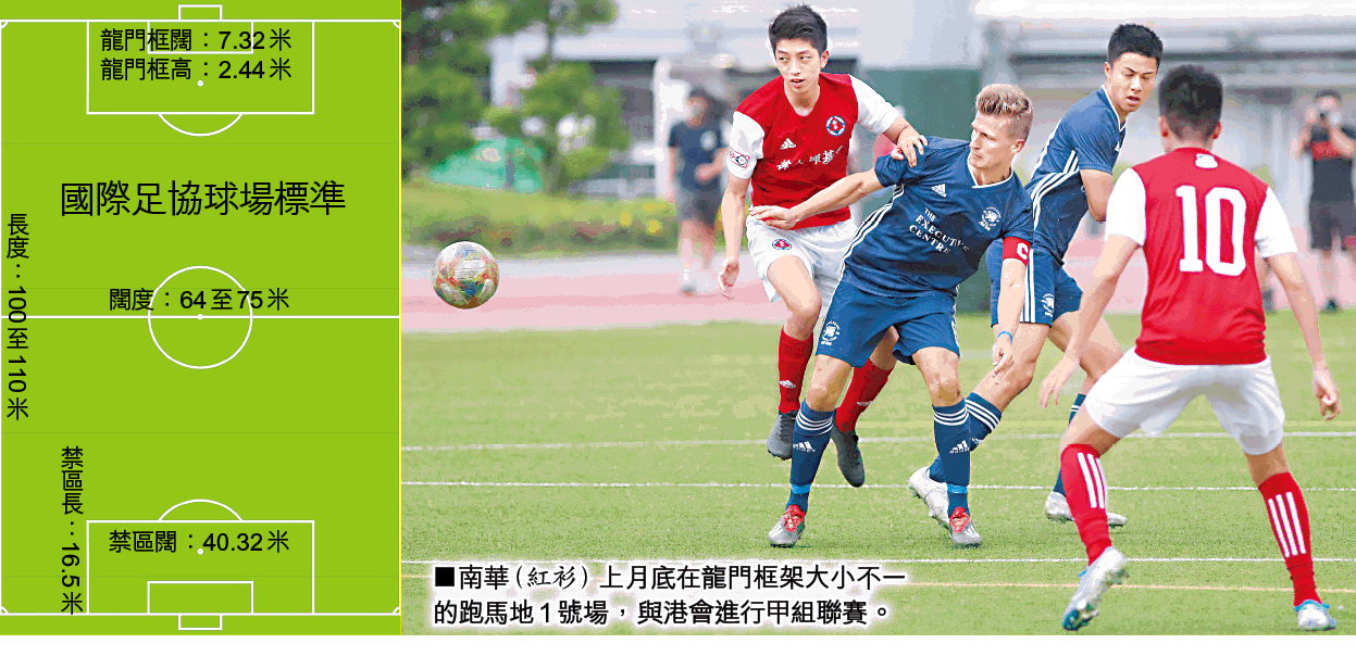 本報調查發現康文署管轄球場近半不達國際足協標準,龍門框也不符高2.44米要求,當中跑馬地1號場2個龍門框同樣高於標準,其中一邊高度達2.53米。南華領隊鄧柱盛上月在跑馬地1號場踢罷甲組聯賽對港會,獲悉龍門框高度不合標後,向足總監場投訴龍門框高矮不一影響賽事公平性,希望有關方面正視設施不合標準問題,球員希望場地硬件上不能隨隨便便。
