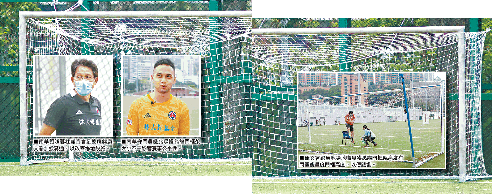 據悉,自爆出有足總賽事因龍門框不標準而被腰斬後,康文署通知所有安排港超聯職業賽事的球場工作人員再三量度龍門框長闊是否合標準,但就未有要求檢查舉行足總業餘賽事的球場龍門框。南華上月底在跑馬地1號場與港會進行甲組聯賽,記者賽後向南華領隊鄧柱盛查詢是否知道兩龍門框高於標準,且不一致。他表示康文署不少場地也不合乎標準,而此場的龍門框似乎比正常稍高;當記者告知其中1個龍門框高達2.53米,他隨即聯同港會職員向足總監場投訴,足總監場隨即通知場地職員,職員不久帶同工具量度門框高度,並向南華職員證實龍門框高於標準。