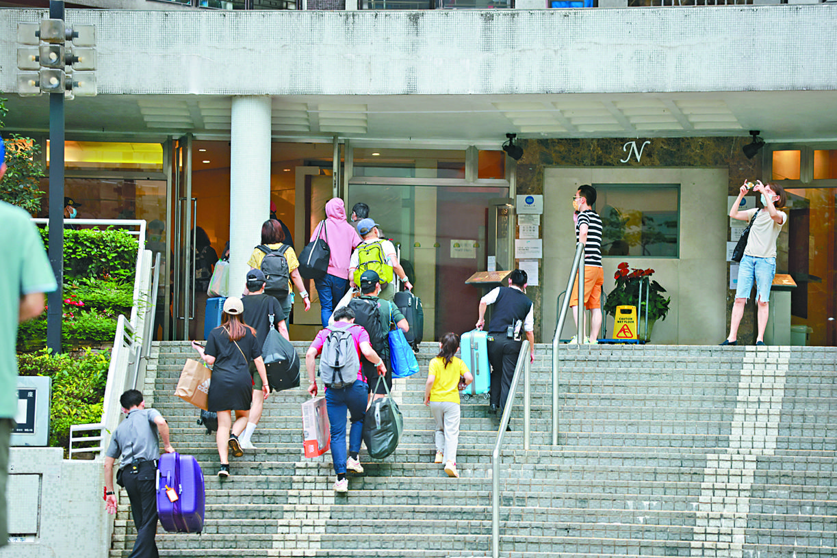 荃威花園R座居民昨午近4時起陸續返回大廈,有行動不便女子乘醫療輔助隊專車回家,保安亦在樓下等候協助她將行李搬落車。傍晚近6時,再有旅遊巴抵達,大批居民拿着一袋二袋落車,情況頗狼狽。