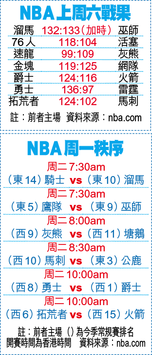 韋斯卜克(Russell Westbrook)上周六取得職業生涯第181次「三雙」,成功追平名宿「大O」奧斯卡羅拔臣(Oscar Robertson)的NBA紀錄,加上比爾(Bradley Beal)獨得50分,作客的巫師戰至加時以133:132險勝溜馬。