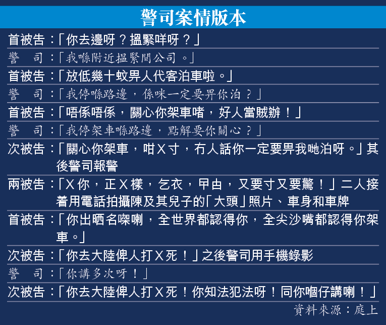 兩被告見陳報警,態度更兇惡,二人更用電話拍攝陳及其兒子的「大頭」照片、車身和車牌。陳稱當時他和兩名兒子都沒戴口罩,擔心此後再到尖沙嘴,可能有人對他們不利。次被告其後再走近車窗,用普通話謂:「你去大陸俾人打X死!」陳此時開啟手機錄影功能,着對方重複句子,次被告走近照做。陳昨在庭上解釋,他間中會到內地探親,擔心會在內地受襲。