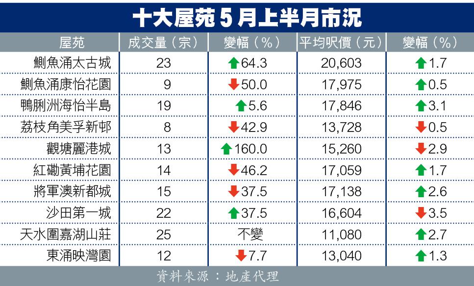 綜合各地產代理數據,十大藍籌屋苑5月上半月錄得約160宗成交,較上月同期173宗減少約7%,惟樓價升勢持續,7個屋苑樓價錄得升幅,升幅最大的3個屋苑依次序為鴨脷洲海怡半島、天水圍嘉湖山莊及新都城,樓價單月漲2.6%至3.1%。