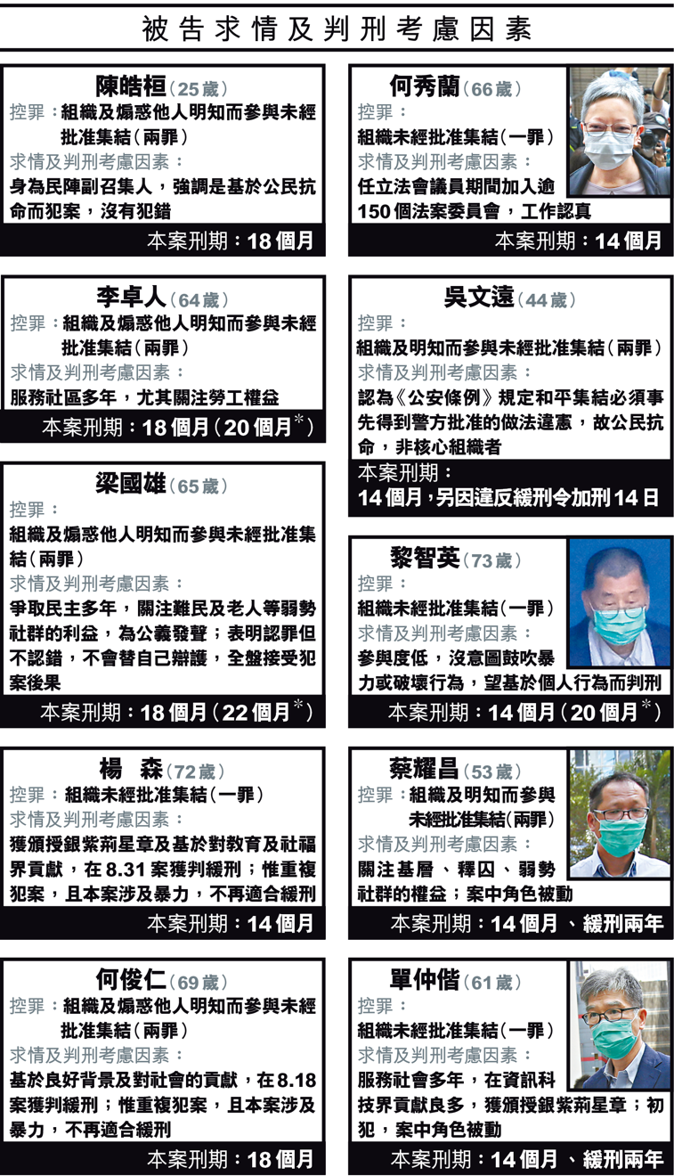 【本報訊】10.1遊行案,壹傳媒創辦人黎智英、支聯會李卓人及民主黨何俊仁等十名民主派人士早前承認組織及參與未經批准集結等罪,法官胡雅文昨判各人入獄14至18個月,其中只有單仲偕及蔡耀昌獲判緩刑。法官判刑時強調,2019年香港社會動盪,案發前數個月內不斷激化,眾被告漠視暴力風險,刻意違法挑戰公眾秩序,須為遊行路線範圍內的堵路、縱火等暴力事件負上刑責。胡官更兩度直斥被告促請群眾恪守「和理非」原則的做法,是「天真和不切實際」。重獲自由的單蔡二人直言判刑史無前例,「香港已經係變咗,法庭亦都已經變咗」,法律團隊很大機會為眾人就刑期上訴。