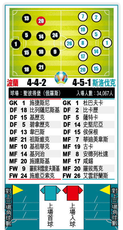 對手斯洛伐克上屆首戰歐國盃即殺入16強,今季當然希望再進一步。雖然該隊同樣球星不多,但防線有國際米蘭中堅史堅尼亞壓陣,中場又有老將咸錫及拿玻里中場盧保卡,實力上與波蘭相差不遠。該隊在2021年5戰不敗,不過卻和了四場,包括兩場歐國盃前熱身賽,分別1:1和保加利亞及悶和奧地利。