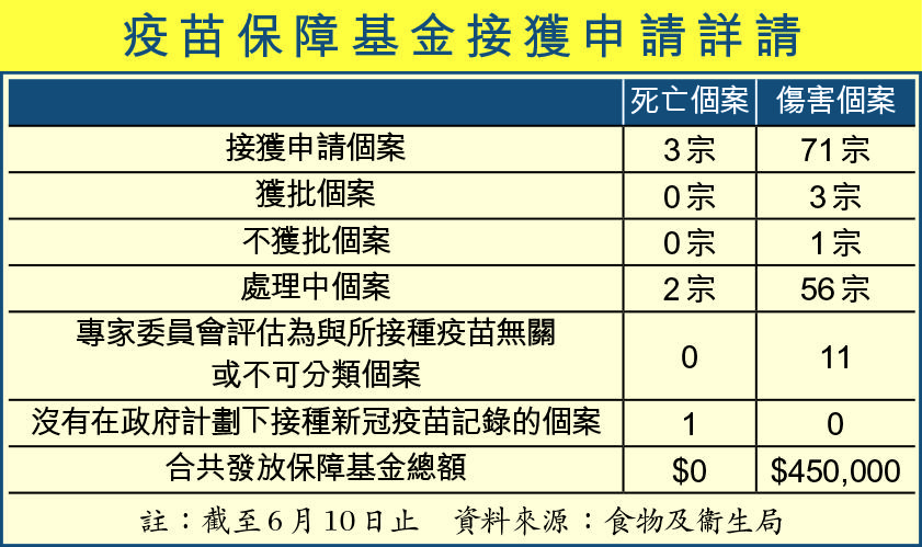 【本報訊】疫苗計劃展開以來,至今最少有21人打針後死亡、3,605人接種後產生異常反應。當初政府注資10億元成立疫苗保障基金,聲稱會為受疫苗副作用影響市民提供經濟支援。惟政府至今接獲74宗索償申請中,僅向三宗申請人提供賠償,合共金額僅45萬元。當局未有透露三宗個案的詳情及賠償額,病人組織認為透明度不足。