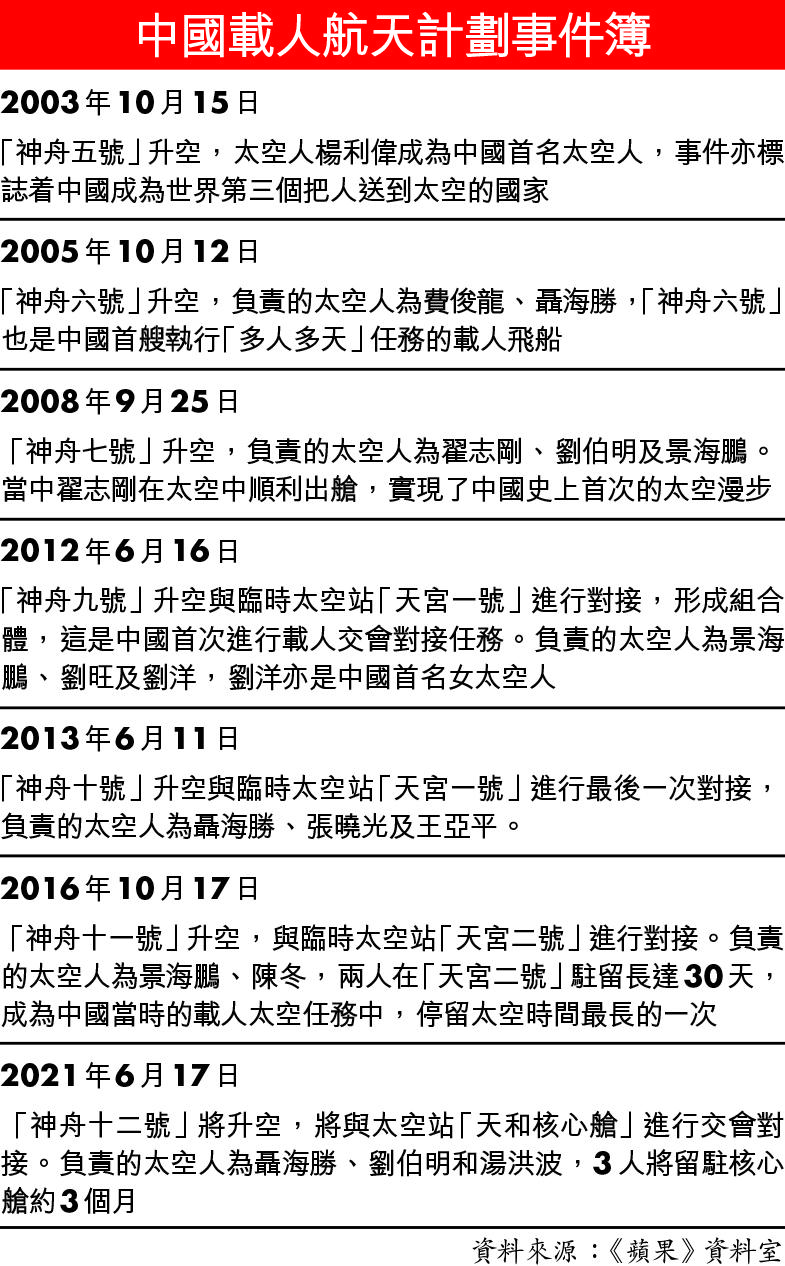 根據當局的太空站建造規劃,中國今明兩年共進行11次飛行任務,目前尚餘兩次太空站艙段發射,三次貨運飛船補給及三次載人飛船發射。當中的載人任務,每次將有三名太空人升空,料明年可在軌建成中國「天宮」太空站及站內的國家太空實驗室,實現中國載人航天工程「三步走」發展戰略的「第三步」。