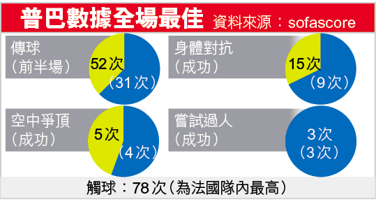 法國正選11人全都踢出水準,否則賽後坦言「收晒貨」的教練迪甘斯,不會踢至89分鐘才作首個換人調動,但若要從中選最佳,必是賽後當選最佳球員的普巴。普巴今仗在中場甚具大將之風,上半場多次以精準長傳轉移,攻擊德國兩閘的空位,其中全場唯一入球,正是普巴用腳面乖巧送出美妙過頭波,給予從左路入楔的盧卡斯靴南迪斯,後者再第一時間傳中令曉姆斯不慎擺烏龍,這記傳送足見普巴傳球視野之闊。普巴是今仗在德國前半場傳球最多的法國球員,多達31次,而且贏得9次對抗、4次爭頂成功及3次成功過人,數據冠絕全場;全場跑動了10.6公里,交出3次攔截及5次搶回皮球,也反映他對防守的付出。