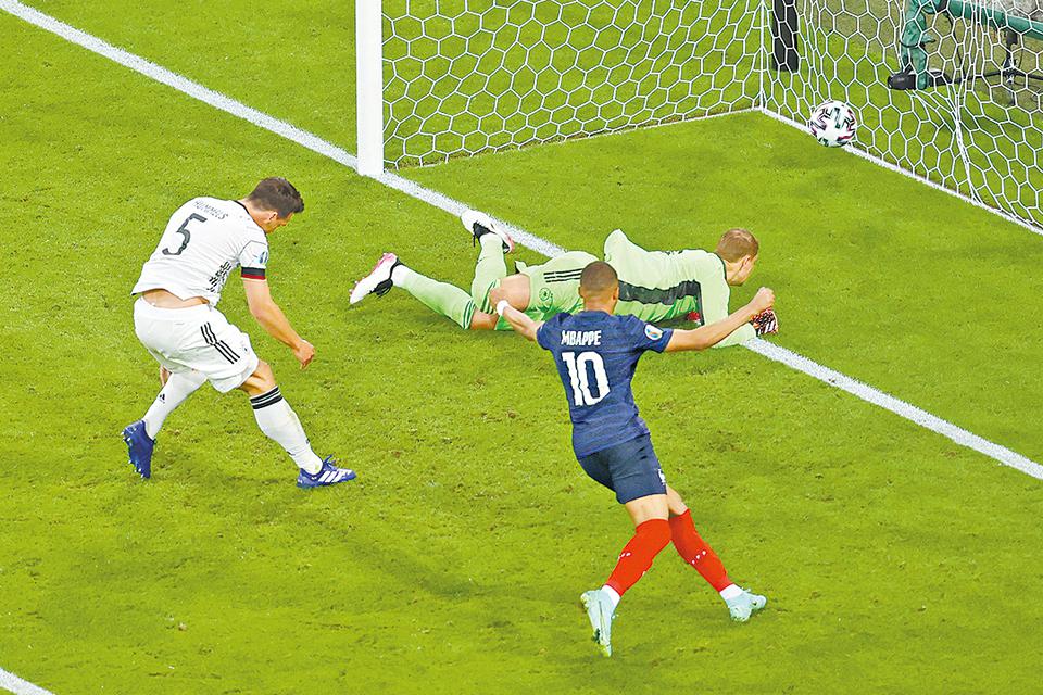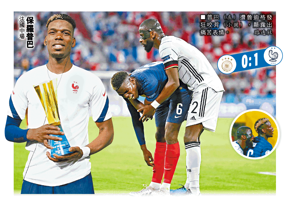 F組另一場德法大戰,周二在慕尼黑安聯球場上演,結果法國藉對方中堅曉姆斯擺烏龍小勝1:0。最大功臣是賽後獲頒全場最佳球員的保羅普巴,今仗各項數據都亮眼,甚至對方中堅魯迪格要出動咬人加胸襲的超技術也阻不了他。