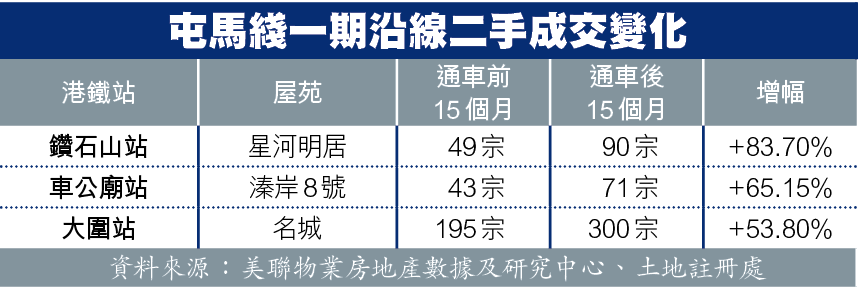 事實上,屯馬綫一期去年2月通車時,沿線二手屋苑交投大幅上升。如接駁屯馬綫及觀塘綫的鑽石山站上蓋指標屋苑星河明居,在通車前15個月內只有49宗成交,而在通車後15個月就大增83.7%至90宗。另外,車公廟站旁的溱岸8號,通車前15個月得43宗成交,通車後錄71宗,上升65%;大圍站旁的名城通車前15個月錄195宗成交,通車後錄300宗,上升53.8%,比全港同期成交量升42.6%為多。