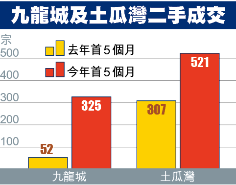 撇除上述收購而來的二手成交,九龍城區今年首五個月成交量比去年同期上升約六成。至於鄰近的土瓜灣區亦有明顯增長,今年首五個月錄得321宗成交,比去年同期上升七成。