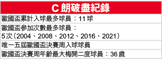 C朗賽後再刷新多項紀錄(見附表),除了以11個歐國盃入球成為該項賽事累計入球最多球員外,亦成史上唯一參加過五屆歐國盃的球員。此外,C朗以36歲之齡在歐國盃決賽周梅開二度更是歷史上年紀最大一人,而他連續五屆歐國盃都取得入球亦是史上唯一。