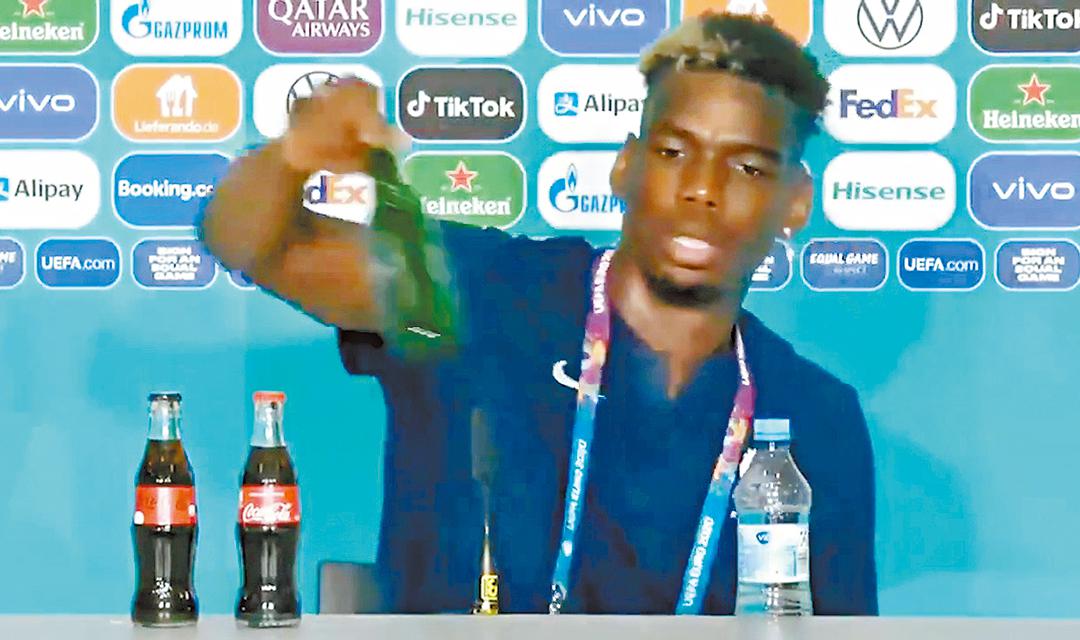 至於法國球星保羅普巴在周二的賽後記者會上亦都有樣學樣,不過他拿走的卻是賽事贊助商的啤酒(下圖)。當時桌上除了可樂和水外,還有一支歐國盃贊助商的啤酒。已在2019年成為了穆斯林信徒的普巴,見狀就將啤酒放在地上,事關酒類飲品對穆斯林而言亦是禁忌之一,相信普巴的舉動可能不想為啤酒贊助商賣廣告吧。