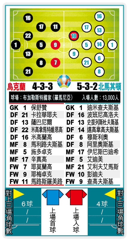 上仗面對坐擁主場優勢的荷蘭,烏克蘭雖然先落後兩球,但仍靠鬥志一度扳平,只可惜尾段失守飲恨。在「核彈頭」舒夫真高帶領下,烏克蘭有一定戰鬥力,踢法非常整體而且有速度,部份前場球員技術不俗,老將耶莫蘭高(圖)破蛋的一球已見其功架。估計今仗舒夫真高仍會維持4-3-3陣式,不過上仗早段因傷被換出的蘇比高夫料會缺陣,或改由馬路斯羅美路擔正,搶攻北馬。別忘記烏克蘭曾在外圍賽有大勝塞爾維亞及擊敗葡萄牙的紀錄,只要今場發揮當時水準,北馬難以招架。